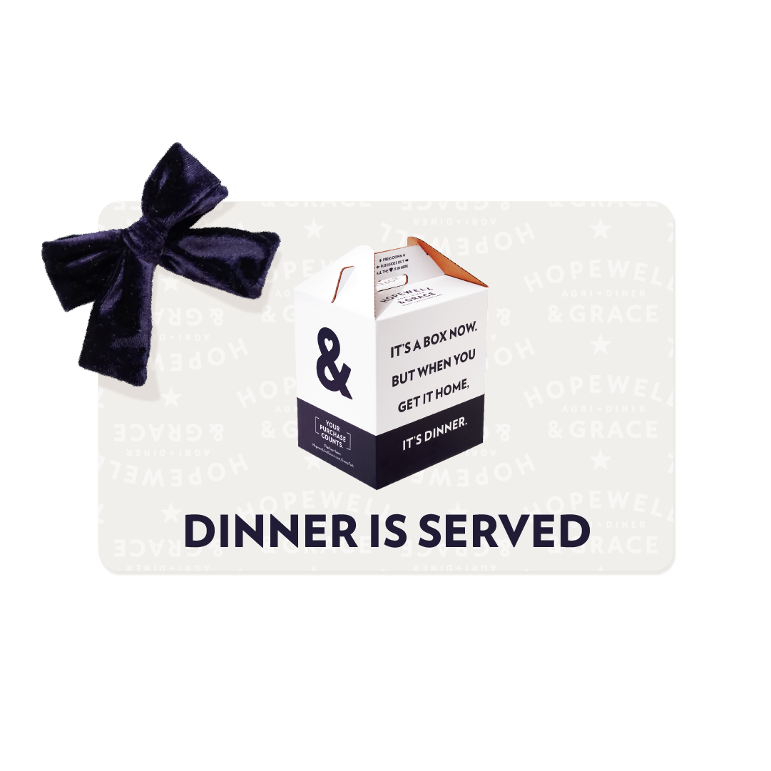 Hopewell & Grace gift cards are perfect for anyone who loves food, likes dinner, or eats meals. Show them how much you care with the gift of an evening around the table with loved ones. Tonight, dinner’s on you.